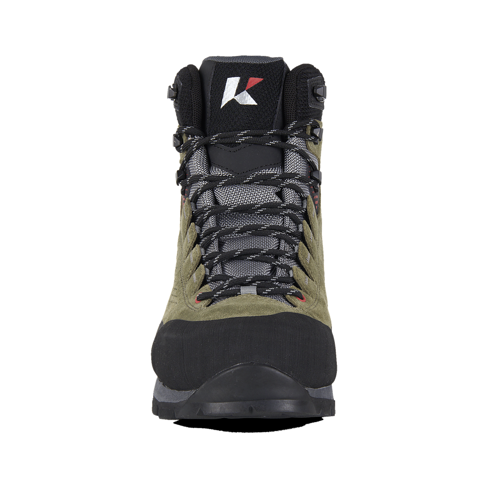 Верх сочетает мягкую замшу и микроволокнистые вставки — это делает ботинок одновременно лёгким и сверхпрочным. Резиновый мыс и боковые накладки надёжно приклеены к верху, обеспечивая непревзойдённую защиту передней и средней части стопы от ударов и истирания, при этом снижая общий вес конструкции. Внутри — мембрана GORE-TEX® Extended Comfort, гарантирующая сухость и комфорт в любую погоду. Технология Kayland Ankle Lock System надёжно фиксирует голеностоп, предотвращая неестественные движения и снижая риск травм.