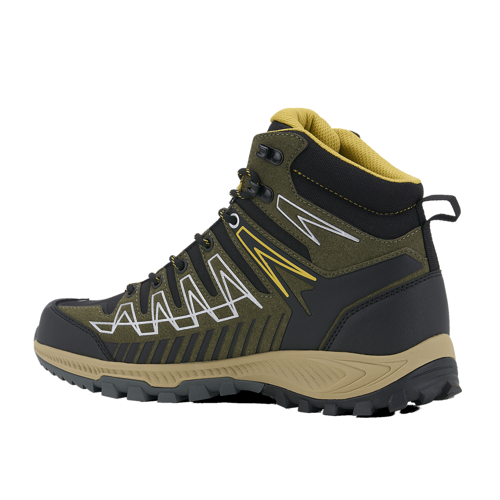 Средняя высота ботинка и мягкий анатомический язычок обеспечивают плотную, но комфортную посадку и надёжную поддержку голеностопа — особенно важную на неровной местности. Система шнуровки сочетает прочные люверсы и металлические крючки, что гарантирует надёжную фиксацию и долговечность. Мысок и пятка дополнительно защищены износостойкой полиуретановой мембраной, которая поглощает удары и предотвращает истирание даже при интенсивной эксплуатации.
