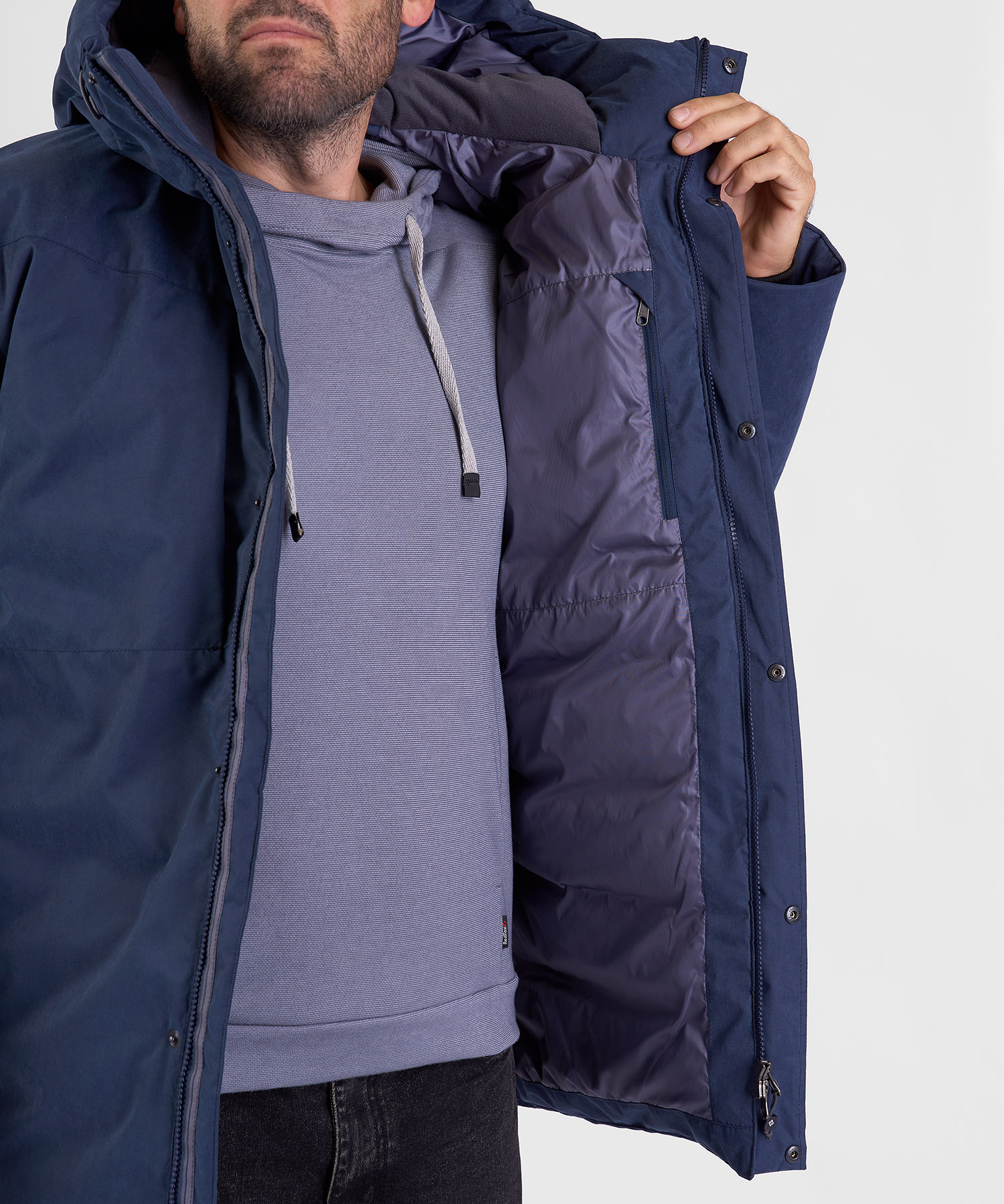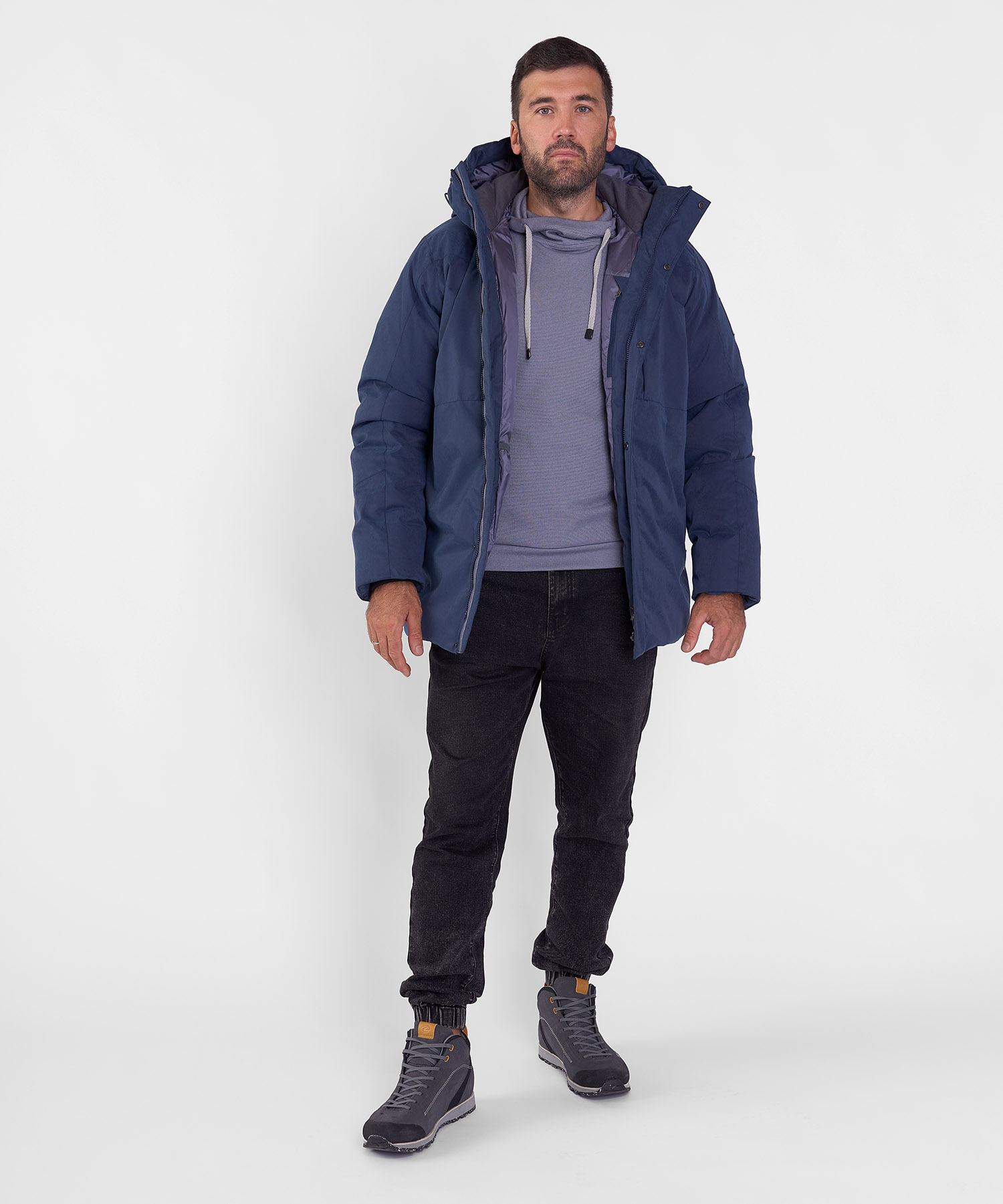 - Ветрозащитная планка на скрытых кнопках + утеплённая подпланка — надёжная герметизация центральной застёжки