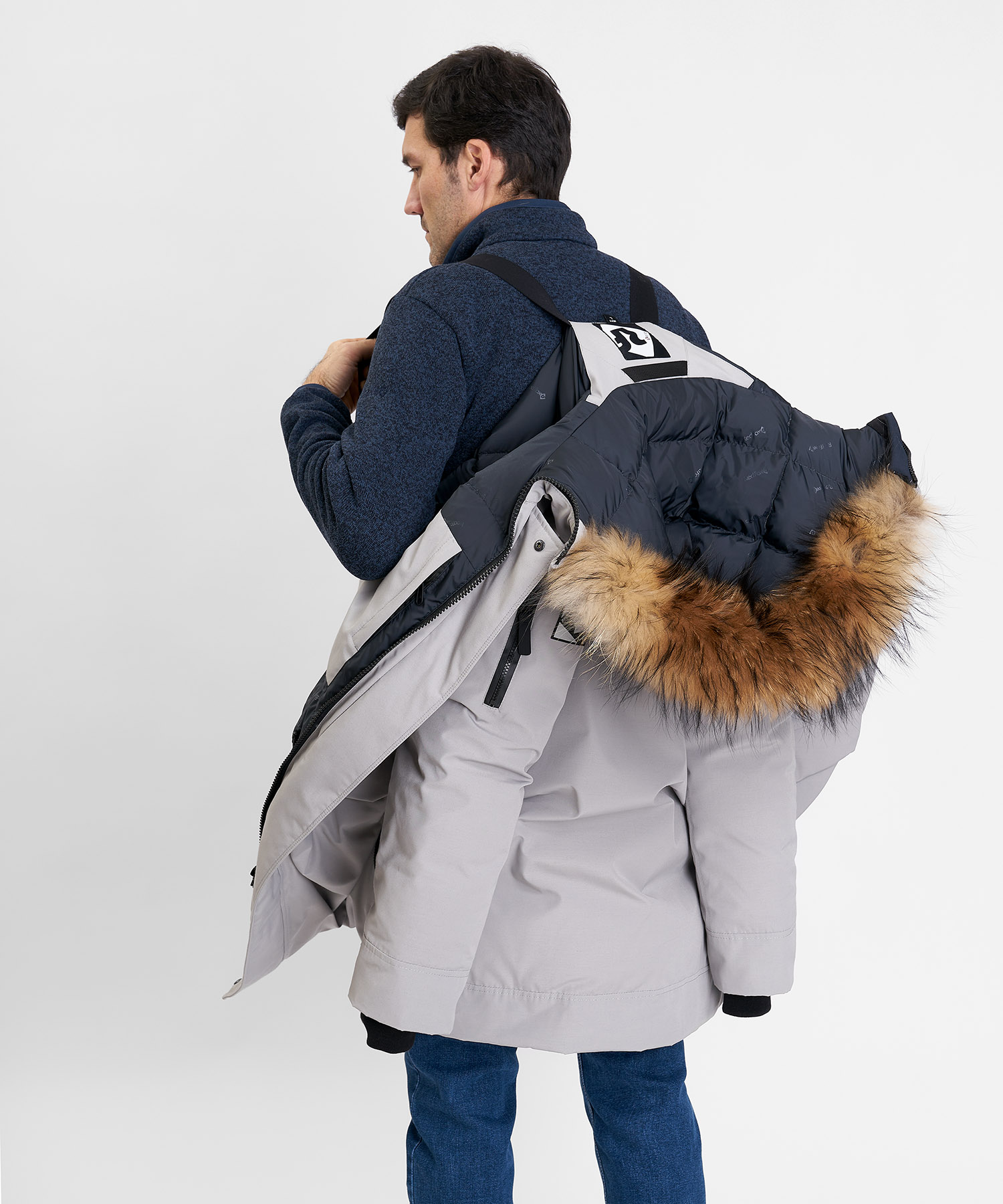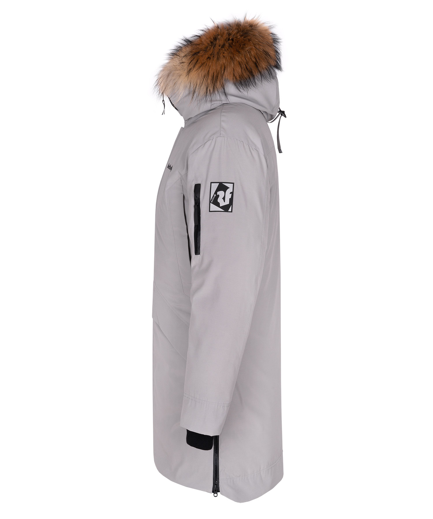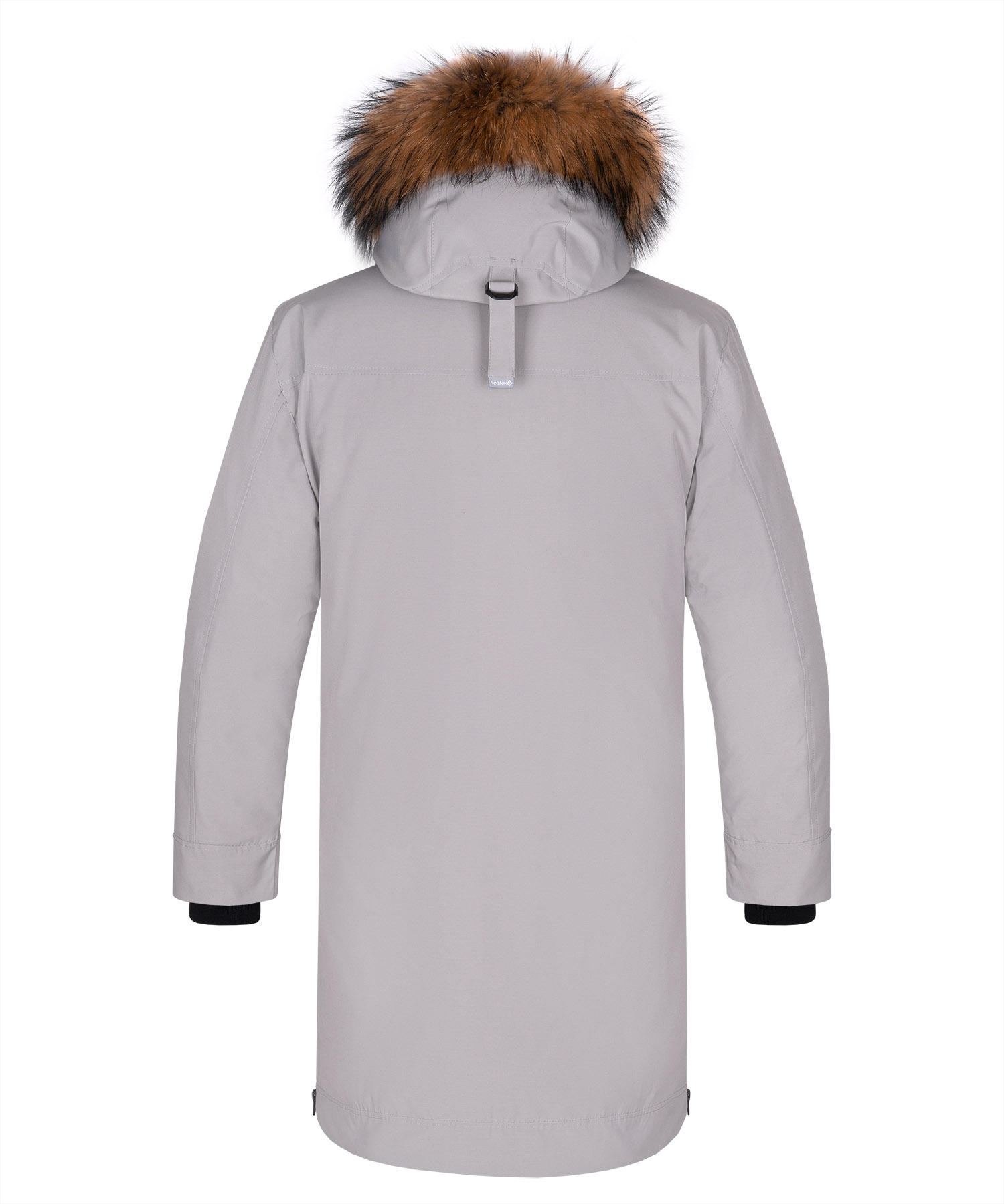 - Съёмная опушка из натурального меха енота — защищает лицо от обморожения, легко снимается при смене погоды