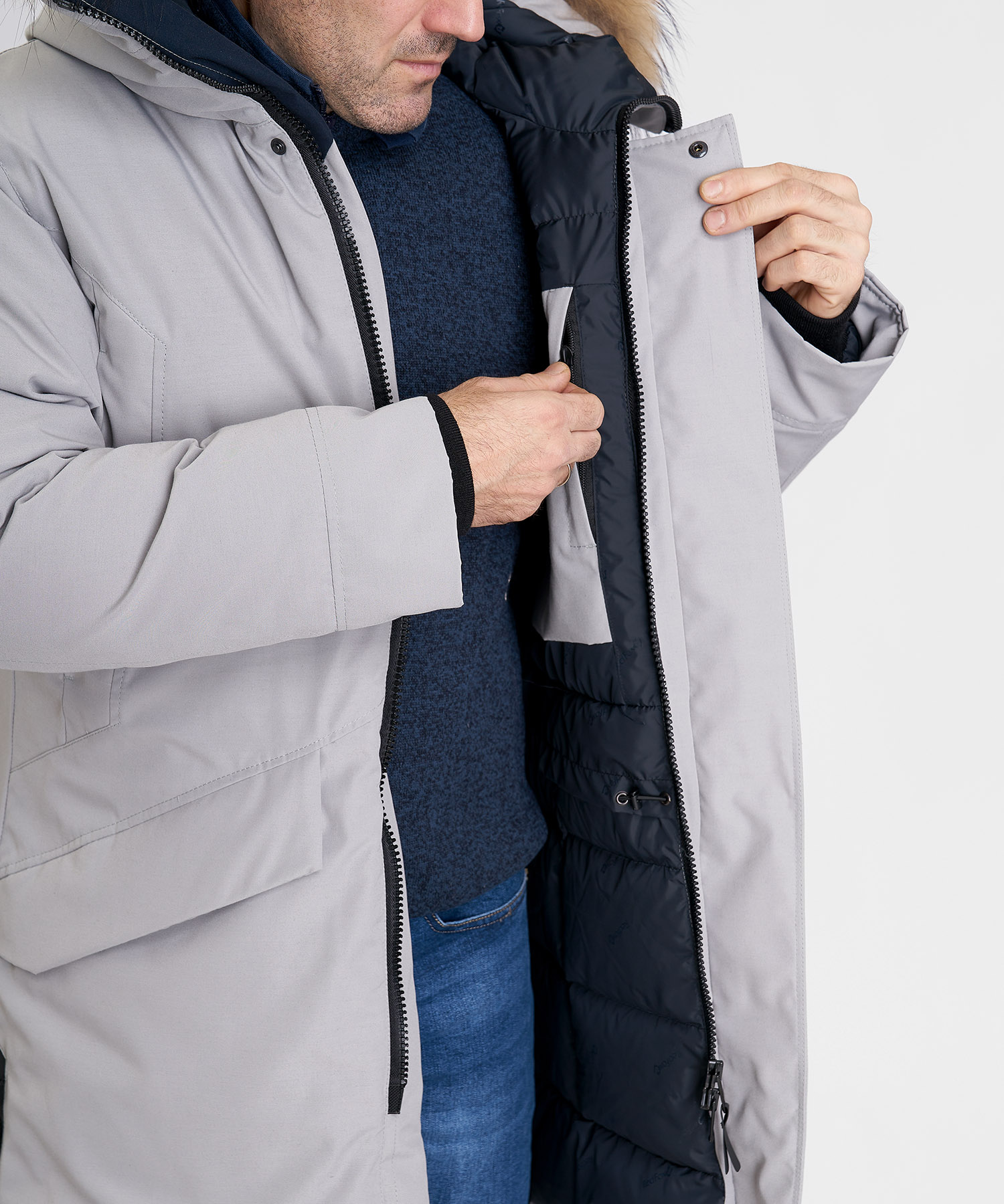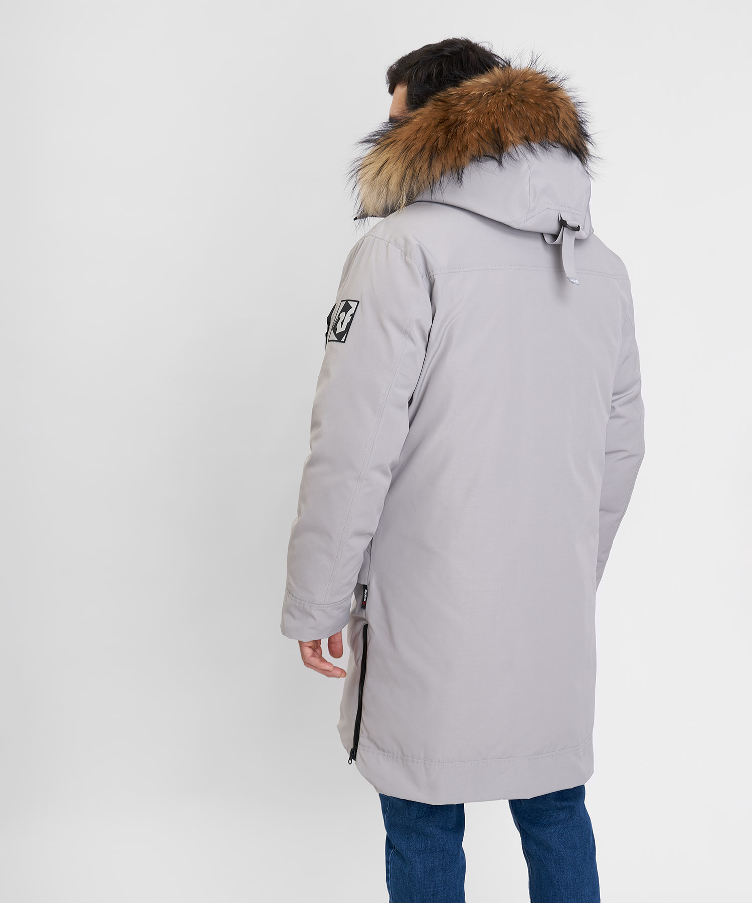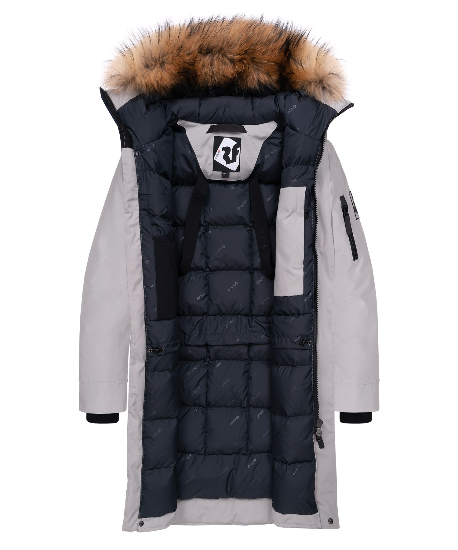 - Съёмная опушка из натурального меха енота — защищает лицо от обморожения, легко снимается при смене погоды