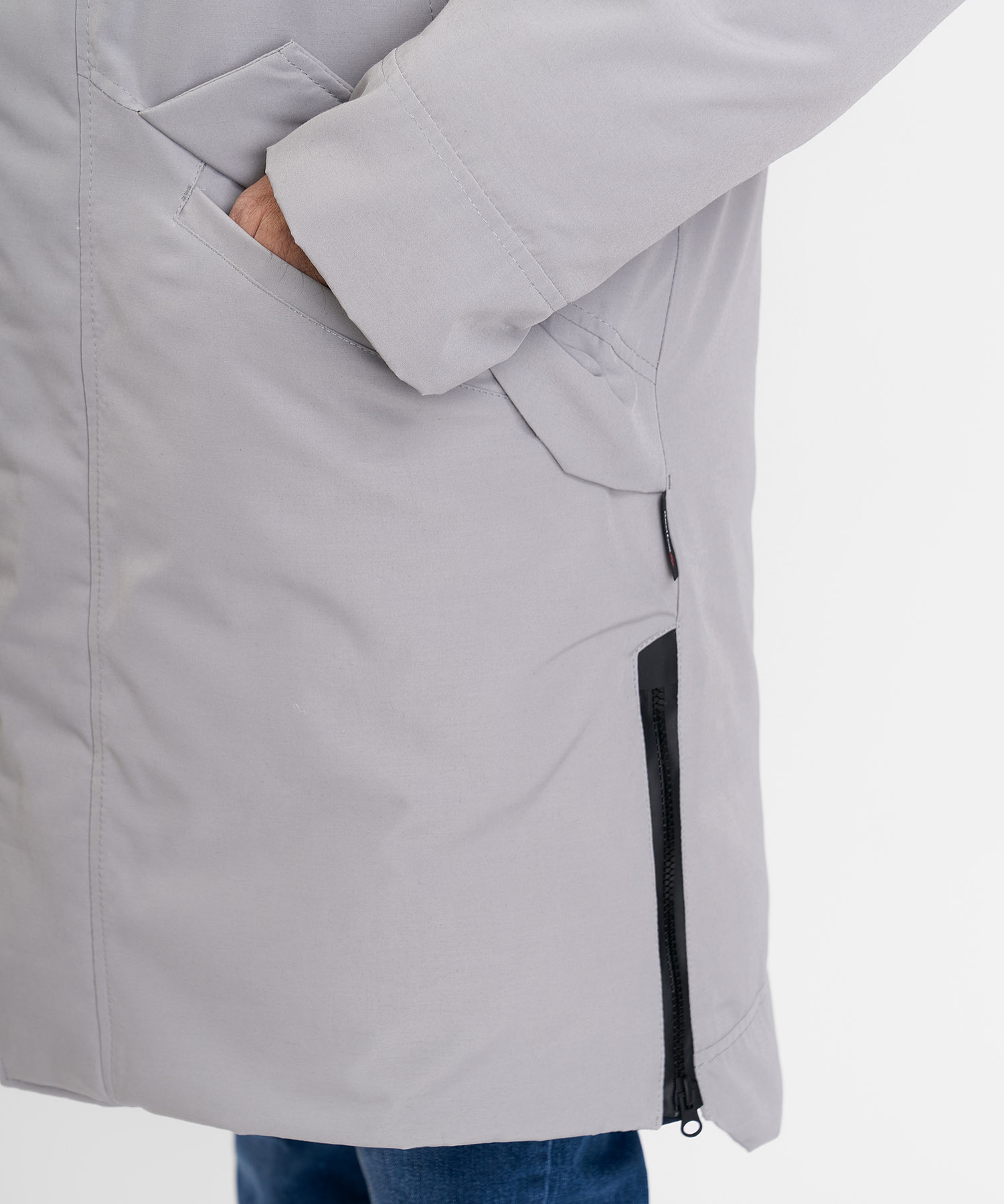 - Боковые разрезы с влагозащитными молниями — дают доступ к карманам брюк без снятия пальто (особенно удобно для охоты и рыбалки)