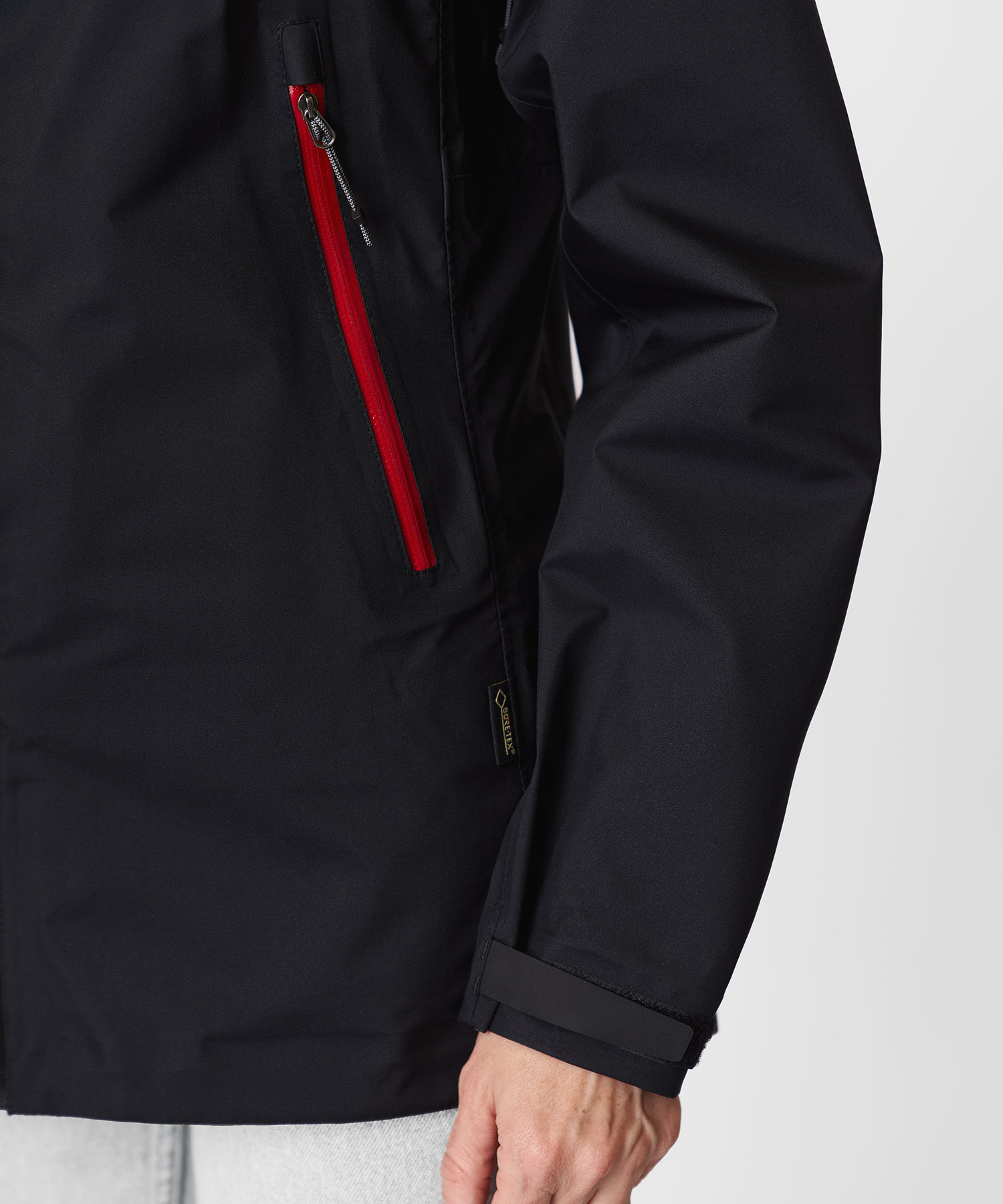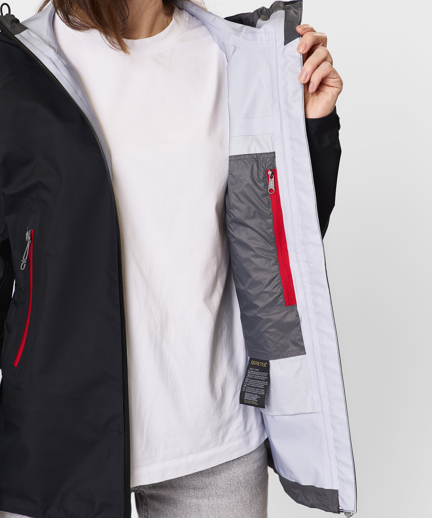 - Основной материал: GORE-TEX® Products — трёхслойная ламинированная ткань (100% нейлон, полотняное переплетение, 30D, 100 г/м²), обеспечивающая полную непромокаемость, ветрозащиту и отличную дышащую способность даже при высоких нагрузках.