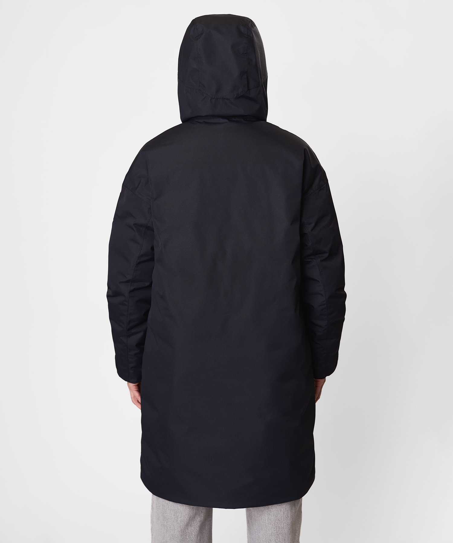 Наполнитель — качественный утиный пух 80/20 с показателем пуховой силы F.P. 650+, обеспечивающий отличное соотношение лёгкости, объёма и термоизоляции. Двухслойная конструкция пухового пакета предотвращает миграцию пуха и равномерно распределяет тепло по всему корпусу. Внешний материал — мембранная ткань Dry Factor® Advance (100% полиэстер): водостойкость 5000 мм, паропроницаемость 5000 г/м²/24 ч и пропитка DWR делают пальто надёжным барьером против снега, ветра и сырости.