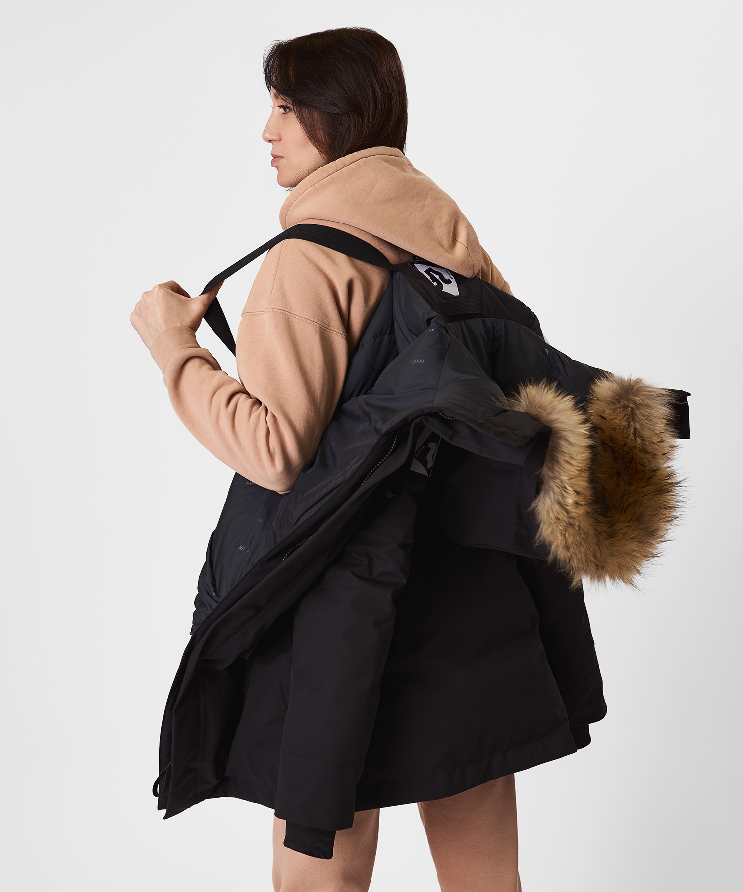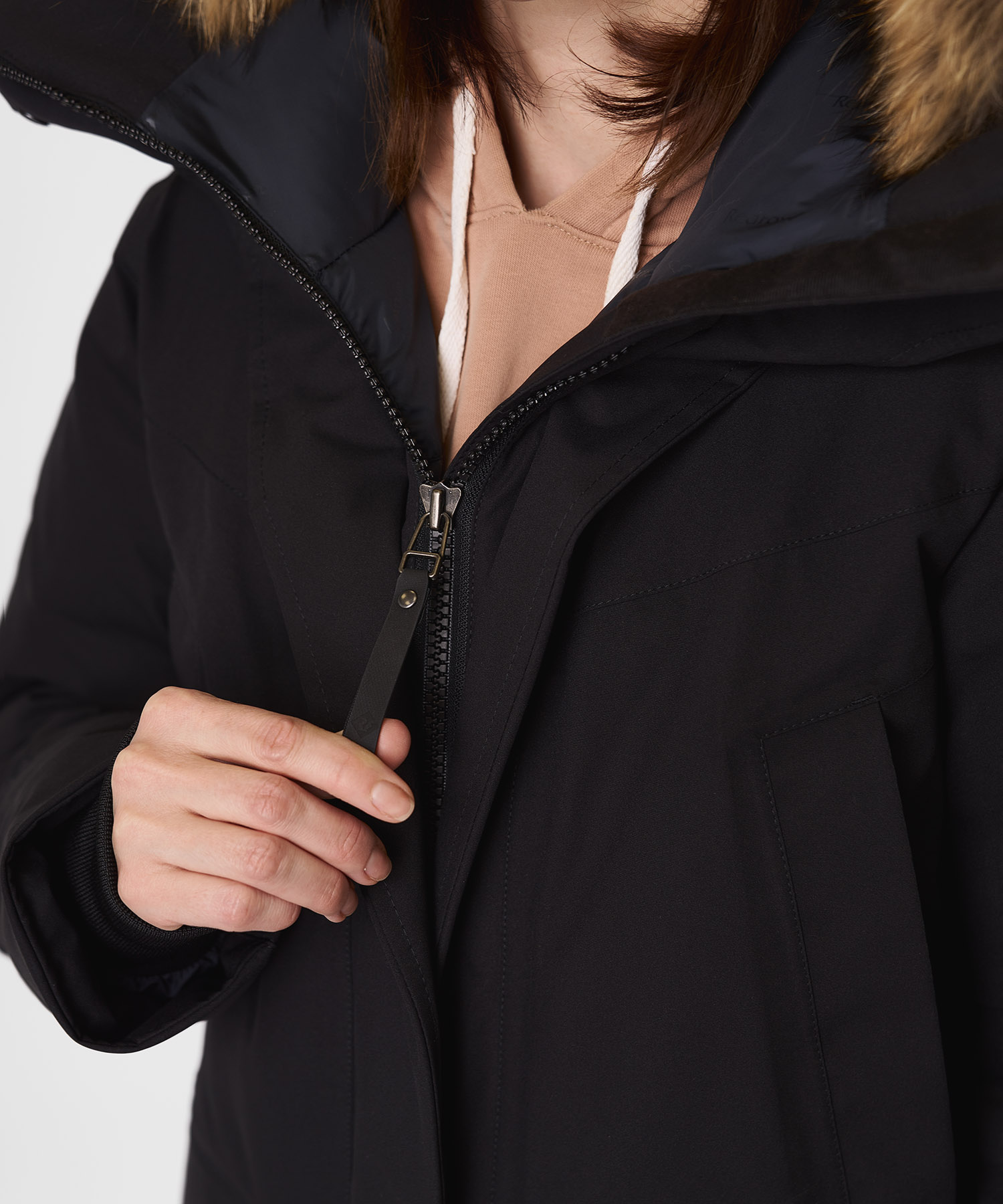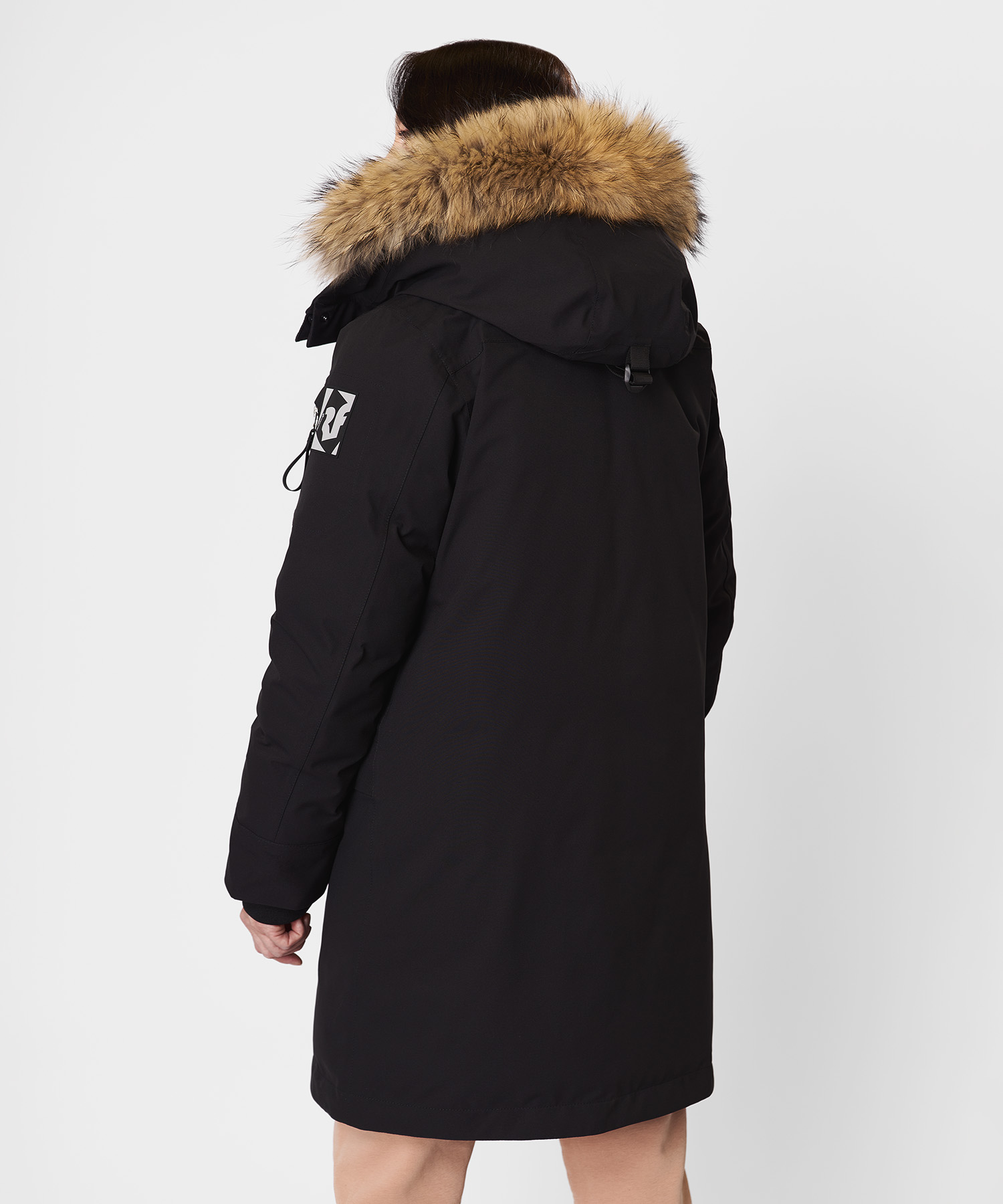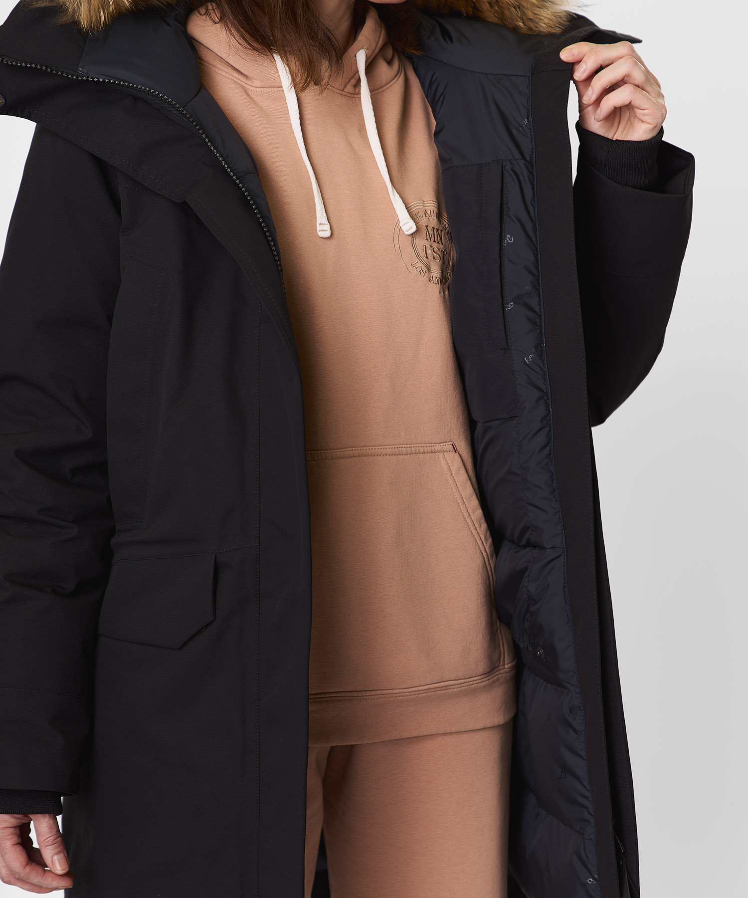 - Съёмная опушка из натурального меха енота на кнопках — улучшает защиту от ветра и предотвращает обледенение