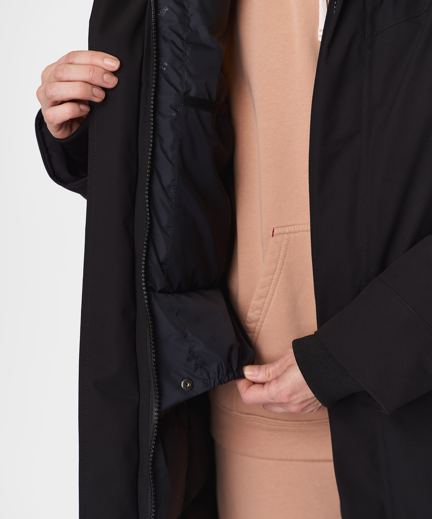 - Регулируемые по длине рукава + удлинённые внутренние трикотажные манжеты — полная защита запястий от холода