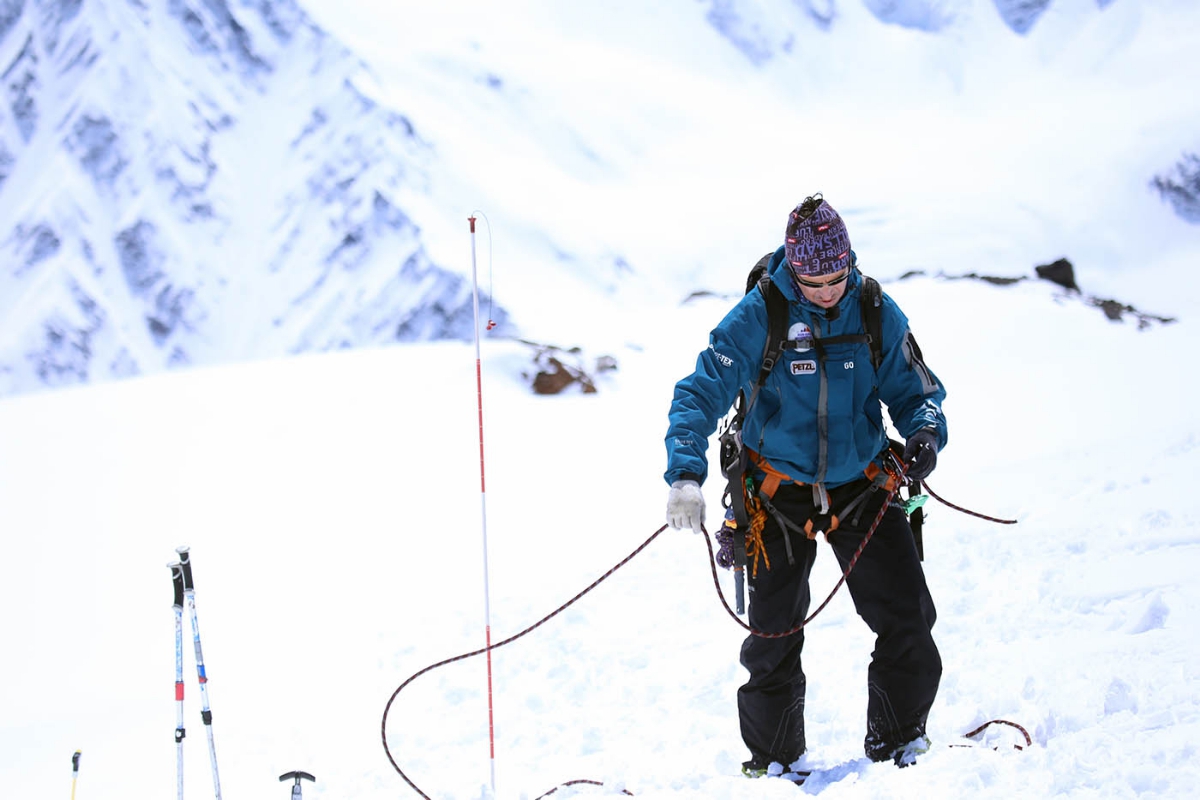 Парни и девчонки в ярких куртках с логотипом Ассоциации горных гидов России апрель и начало мая провели в Кабардино-Балкарии. Я не смогла, к сожалению, присоединиться к ним на время экзаменов в Адырсу. Но зато в Приэльбрусье посмотрела, как курсанты второго потока сдают тесты по поиску в лавине и подъему из трещины.