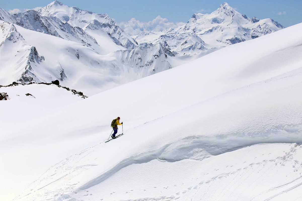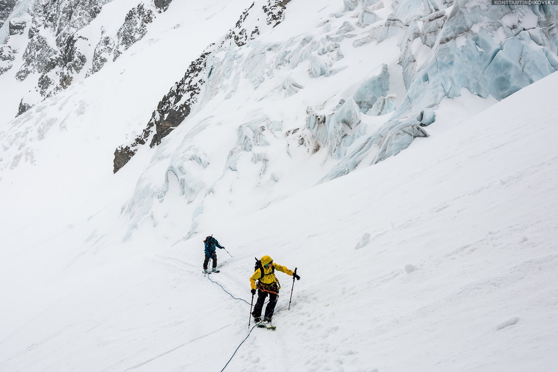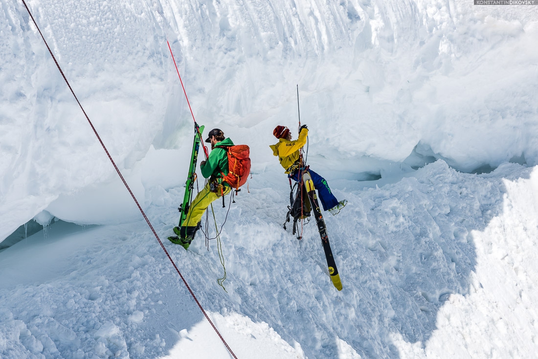 Денис Симавский: Есть клиенты, которые едут за экстримом, за острыми ощущениями. У нас есть Николай Веселовский, лидер нашего хели-ски. И достаточно большое число клиентов едут именно к нему. Его напарник француз, выпускник школы ENSA. И, как и большинство ее выпускников он, скорее, альпинист. А они ведь катаются там, где захотят. Так что траверсы над сбросами для них - привычное дело. Это мое частное мнение. Но в этом есть некий элемент экстрима.