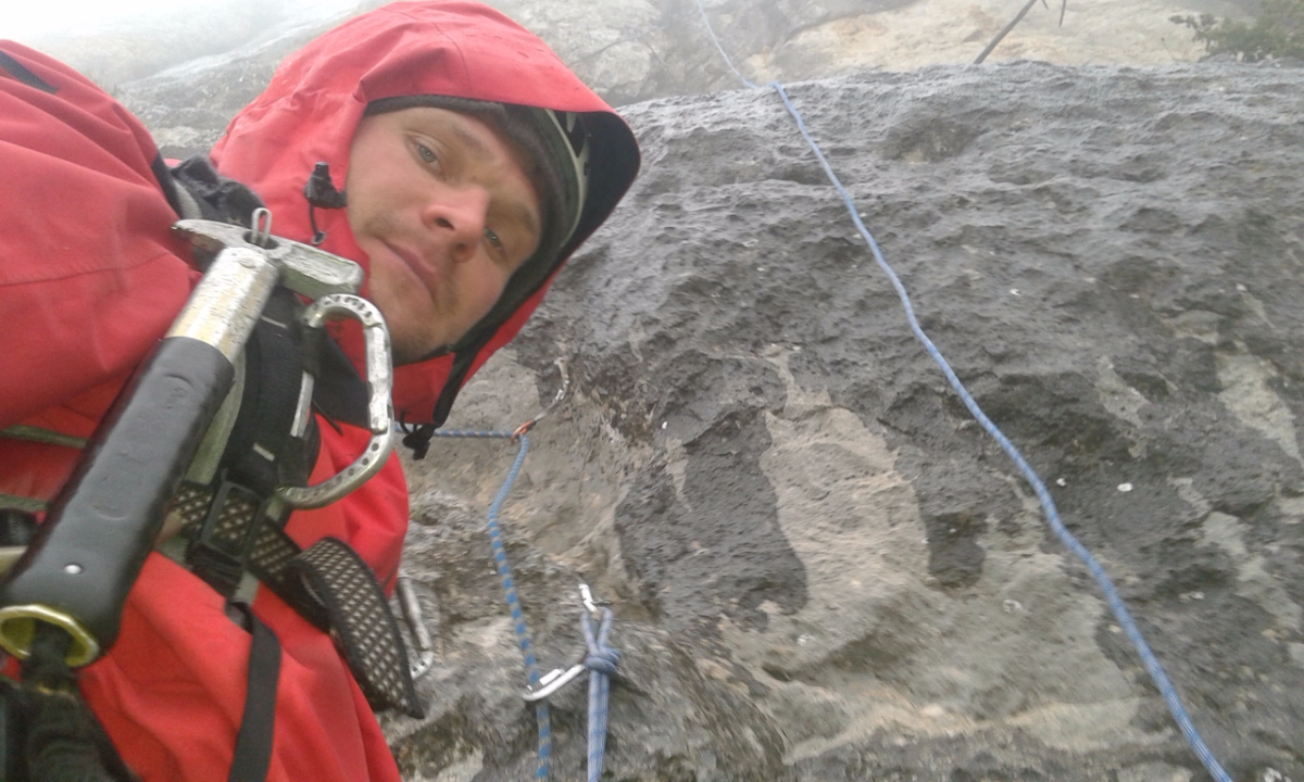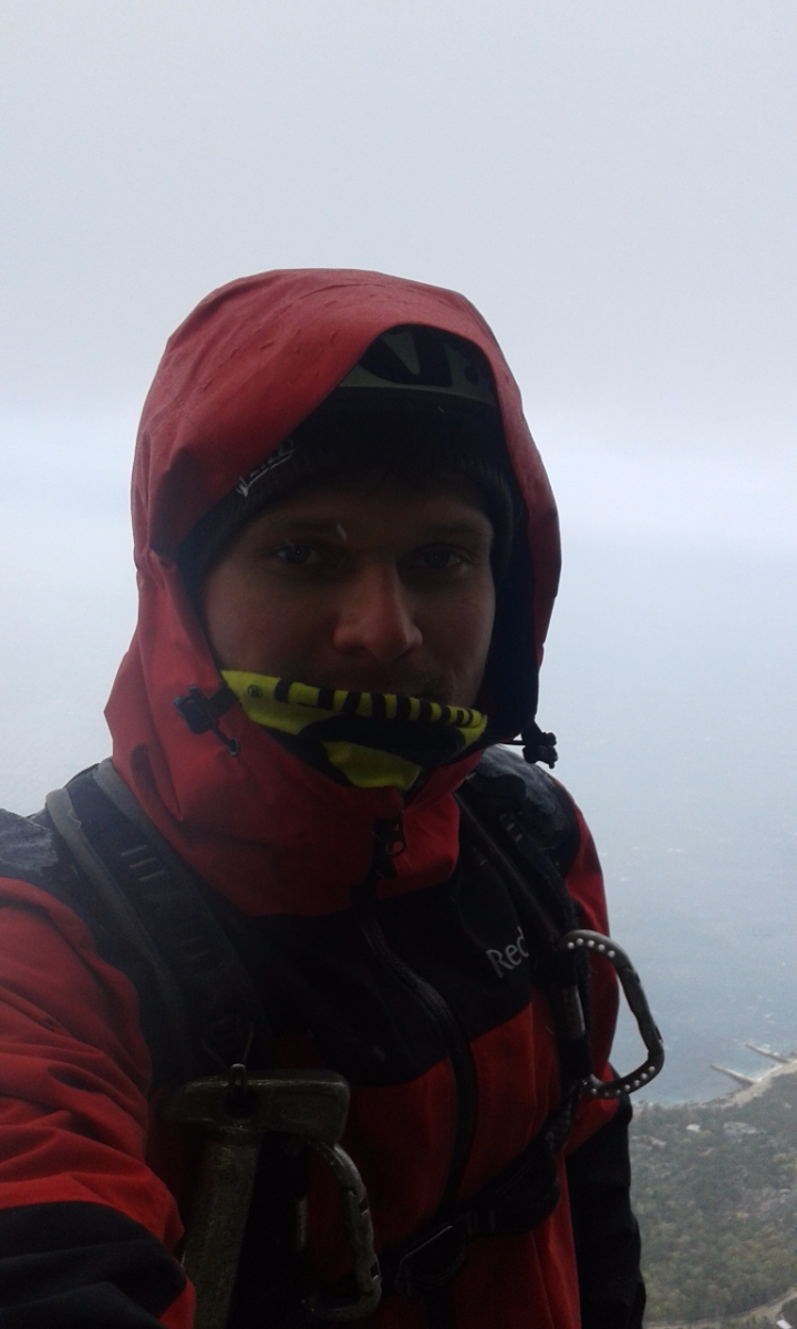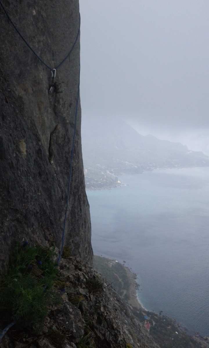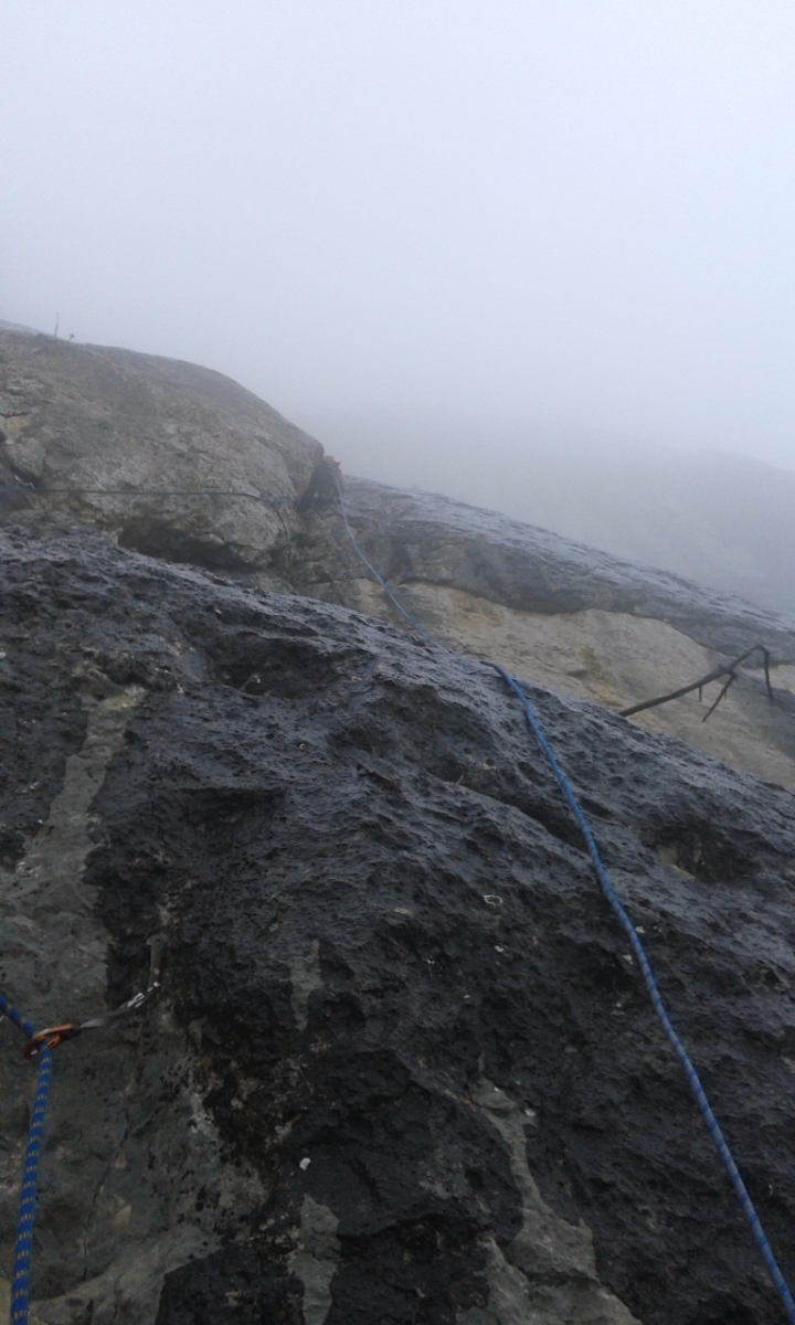 Второй день 12-ти часовой марафон на Куш-Кае. Погодка была не самая Крымская. На первом же маршруте через час после выхода начался дождь, температура упала. По стене побежали речки. Но мы с Игоряном не унывали - это ж альпинизм! Достали из рюкзака офигенные мембранки Red Fox X5 GTX, одели и бомбили в них до конца дня. Остались сухие, и сильно не потели.