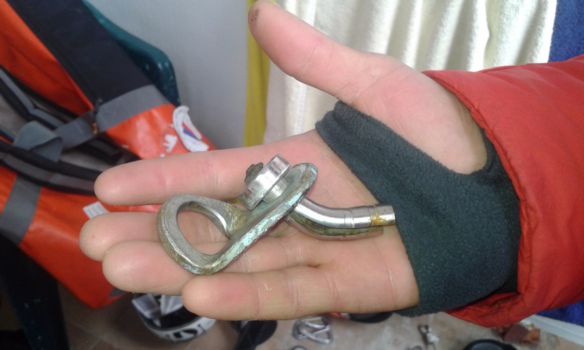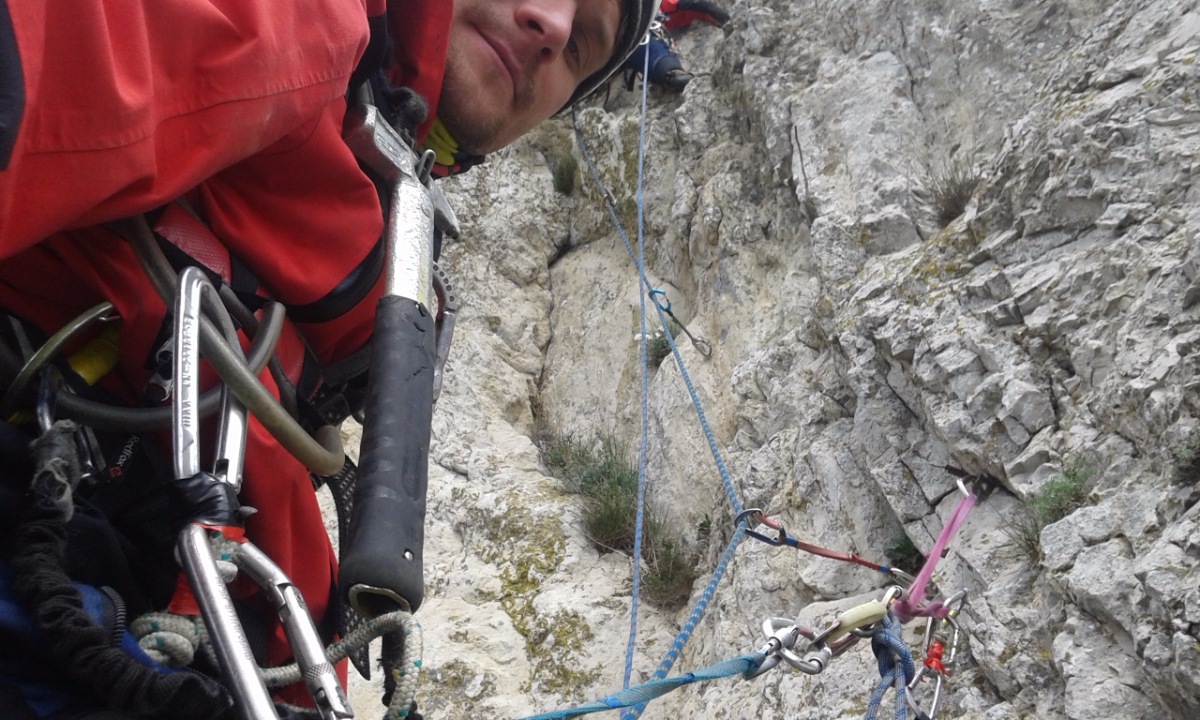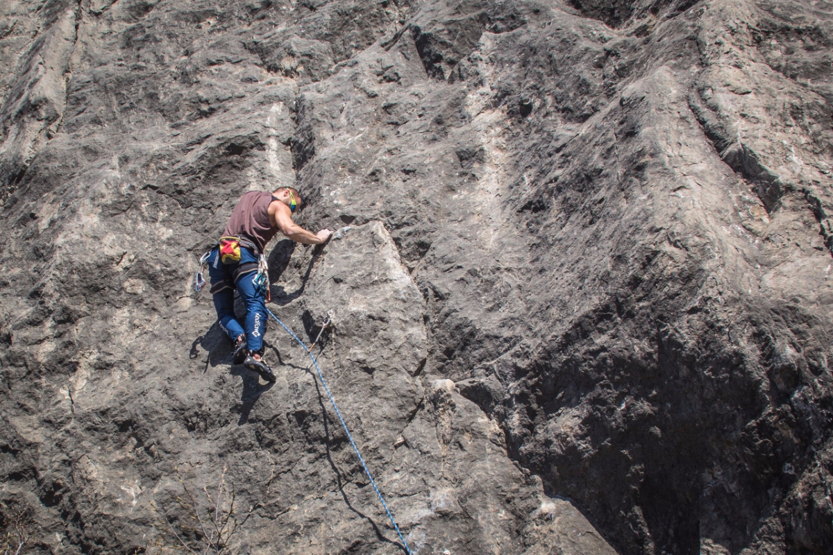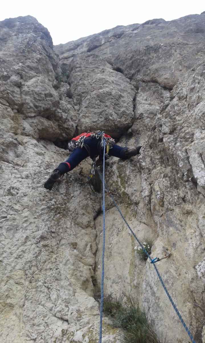 R3-R4. (25-30м) Ключ маршрута. С вершины «Варежки» вправо вниз спуститься на 2м, траверс вправо 2м, затем вверх 3м на скайхуках к старому шлямбуру. Если откинуться от станции можно увидеть справа в 5 метрах и по высоте в 3 метрах этот шлямбур. От шлямбура на скайхуках ко второму шлямбуру, затем вправо вверх через старый скальный крюк выход на полку в нише. Справа станция на местных скальных крючьях.