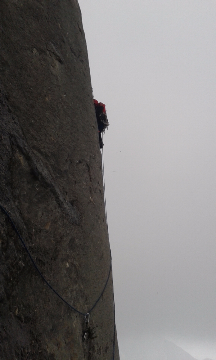 Выбрали первый маршрут справа от Варежки - 6А, Гениуша. Описания нигде нет. Ориентировались как в Больших горах, в тумане, по фотографии. Пролезли не бодро, нам сказали что мы сделали 3-е прохождение маршрута. Лидировал Игорян.