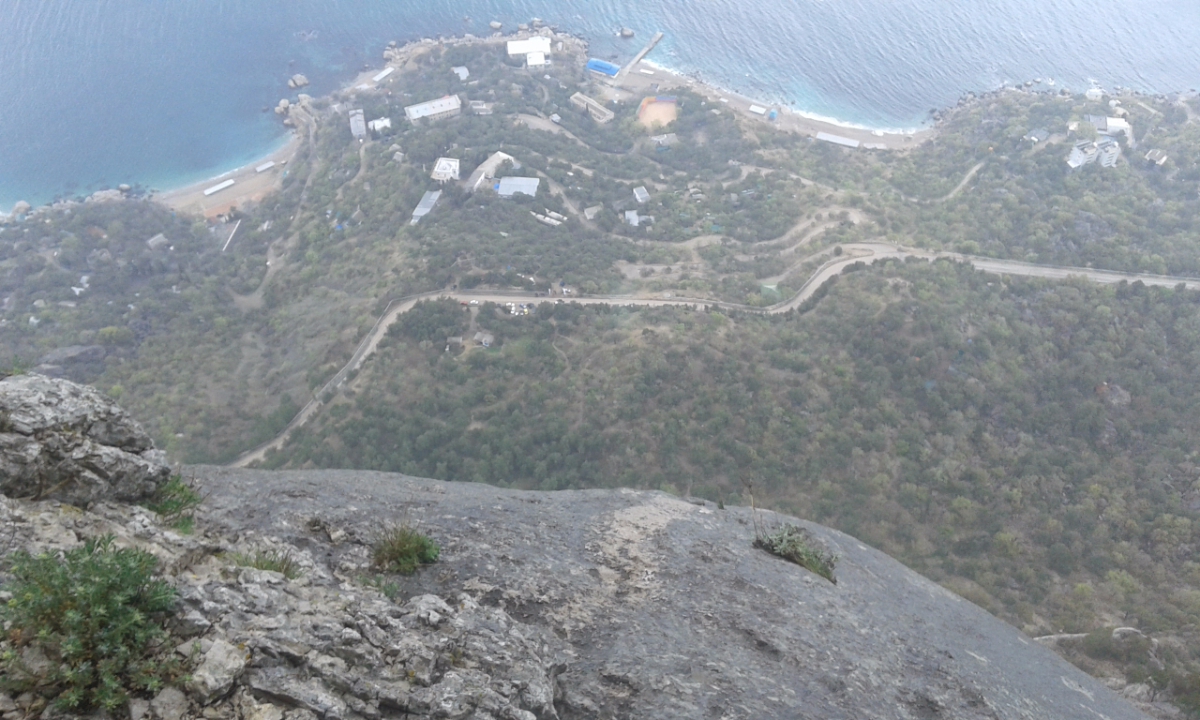 R1-R2. (25-30м) От большого дерева траверс вправо по полке 10м, затем вверх по простым скалам в направлении нависающего разваленного камина. Ориентир вверху слева большой наклонный нависающий внутренний угол. Через нависающий камин выход на косую полочку по большим внутренним углом. Можно организовать станцию. Есть 2 скальных крюка.