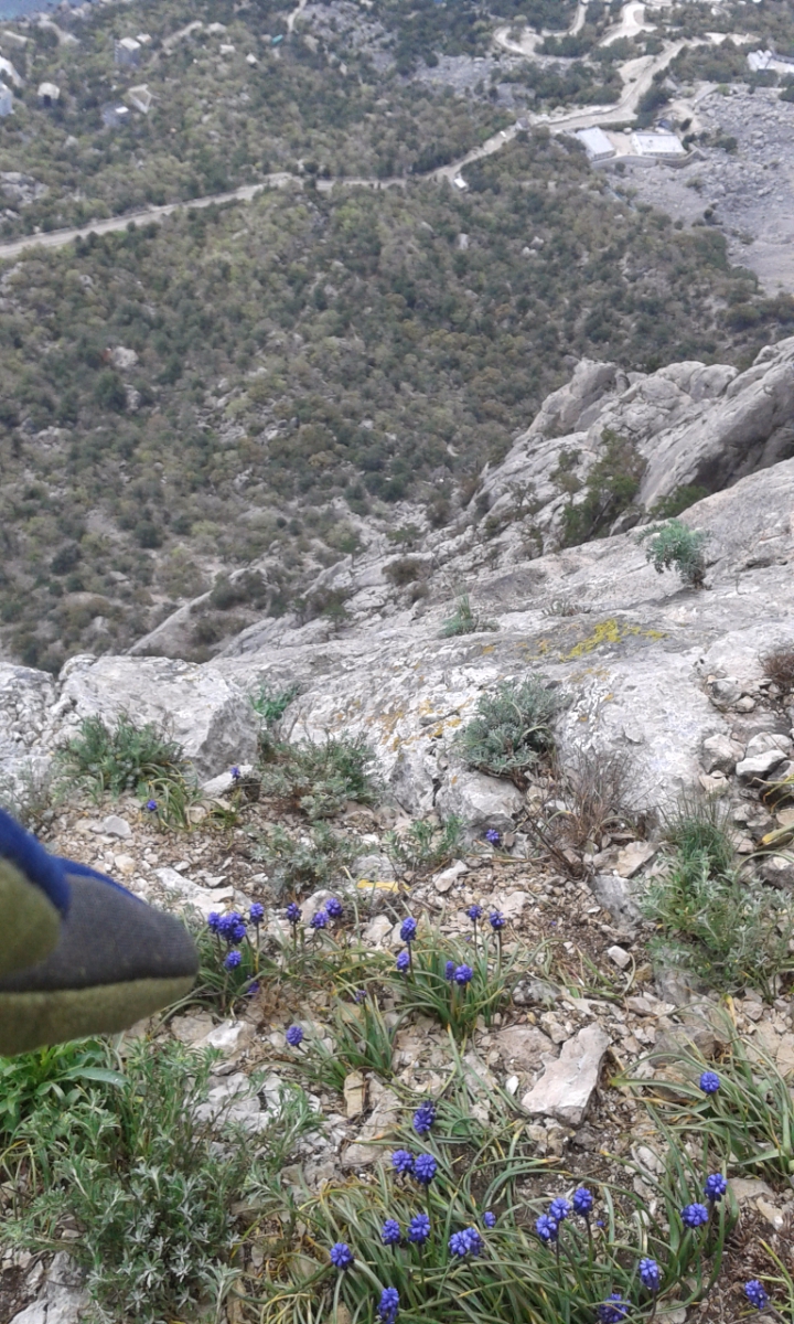 R6-R7. (25-30м) С балкончика по несложным скалам вправо вверх, в направление понижения на яйле. Выход на яйлу.