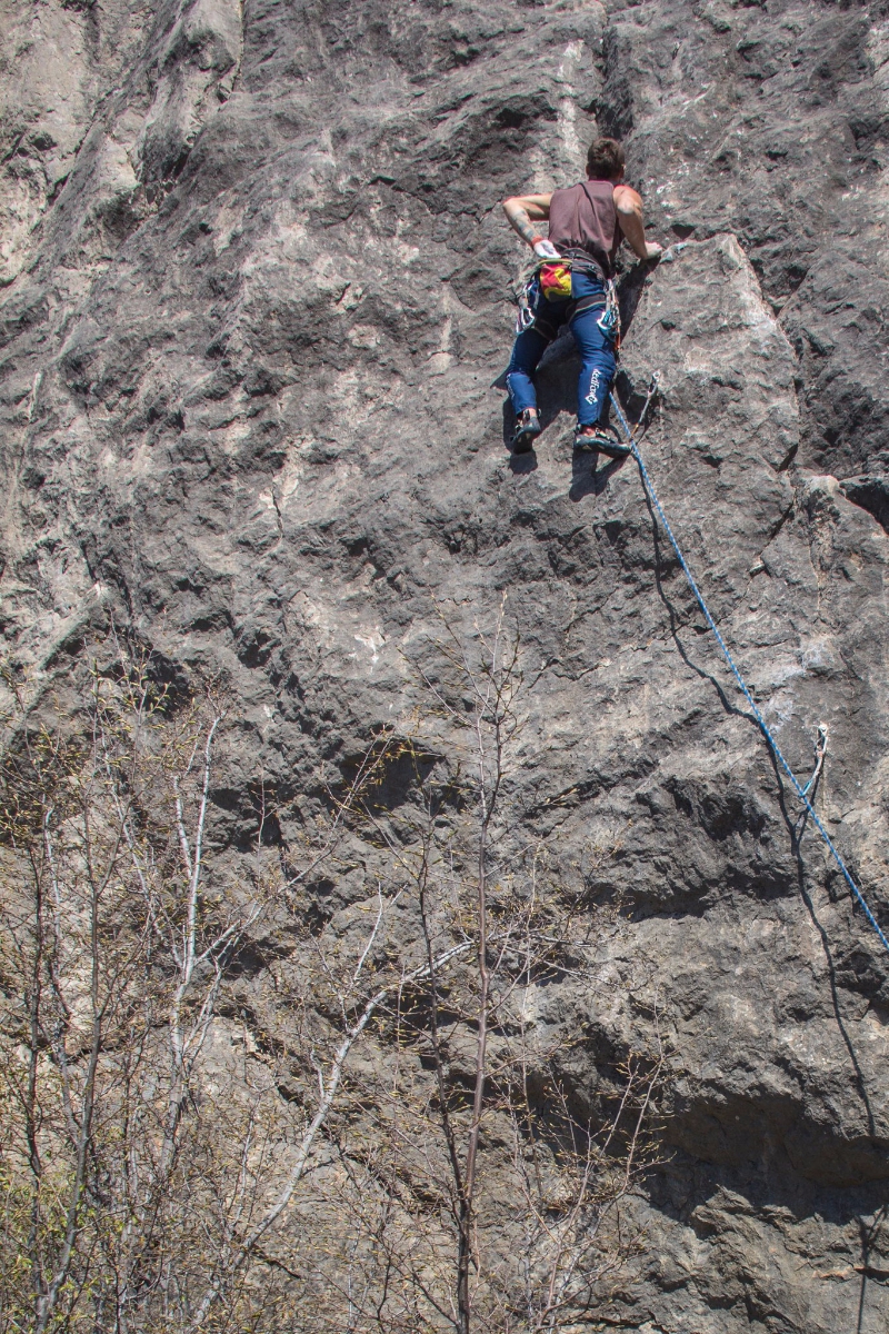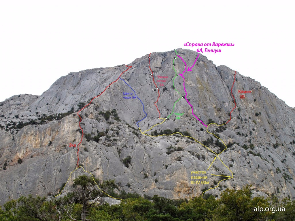 R0-R1. (35-40м) Начало маршрута в 10 метрах левее от маршрута «Левая Штанина». С полки влево вверх 10м простое лазание, выход на полочку под нависающий камин с травой. По камину вверх 7м на ИТО, затем по наклонному внутреннему углу вверх к большому дереву простое лазание. Тут выход на большую полку, на которой сходятся маршруты слева «Варежка», справа «Левая штанина».