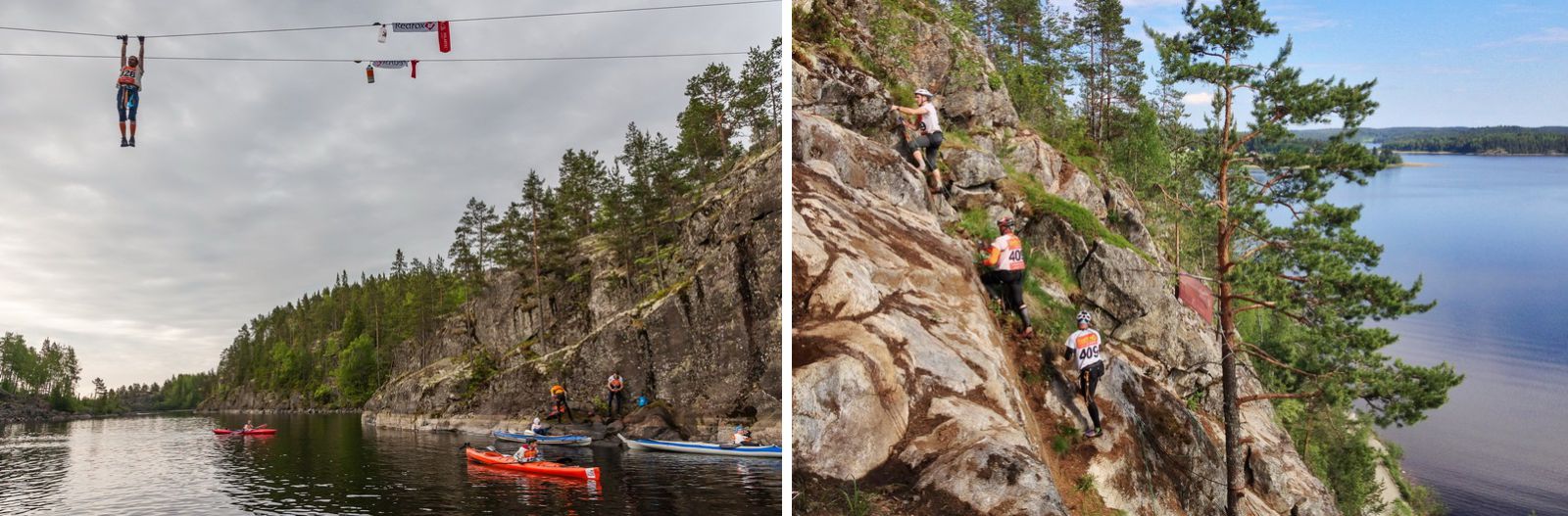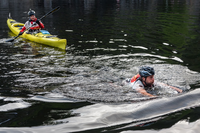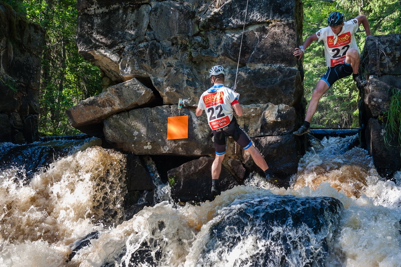 В общем, так оно и вышло. Многие приехали с целью именно туристической — увидеть дикую Карелию, и потому преодоление себя плюс созерцание дикой природы стало для них лейтмотивом соревнований. Курс был спроектирован так, чтобы спортсменам любого уровня не было скучно, нужно было постоянно переключаться на новый вид передвижения. Скажем, сначала ты отчалил от базового лагеря на байдарке, потом прямо из нее лезешь на скалу, прыгаешь с 8-метровой высоты с троллея в воду, опять гребешь, вылезаешь на берег, чтобы пробежать 10-километровый крюк по изрезанным скальным берегам, и снова возвращаешься за весло. И так двое — трое суток без перерыва.