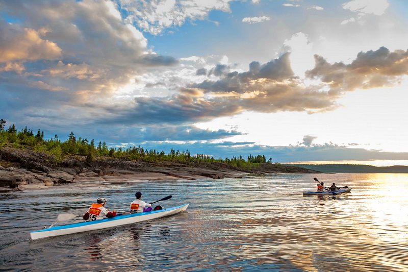 На воде ребят поджидали другие сюрпризы — от полного штиля до встречного сильного ветра и боковых волн, переворачивающих каяки. Так, одна находчивая команда-четверка пересела в трехместную байдарку и взяла беспомощный каяк на буксир. Другие считали, что легче протащить «корабль» на себе по попутным островкам. В общем, смекалка была не последним фактором успеха и скорости прохождения препятствий.