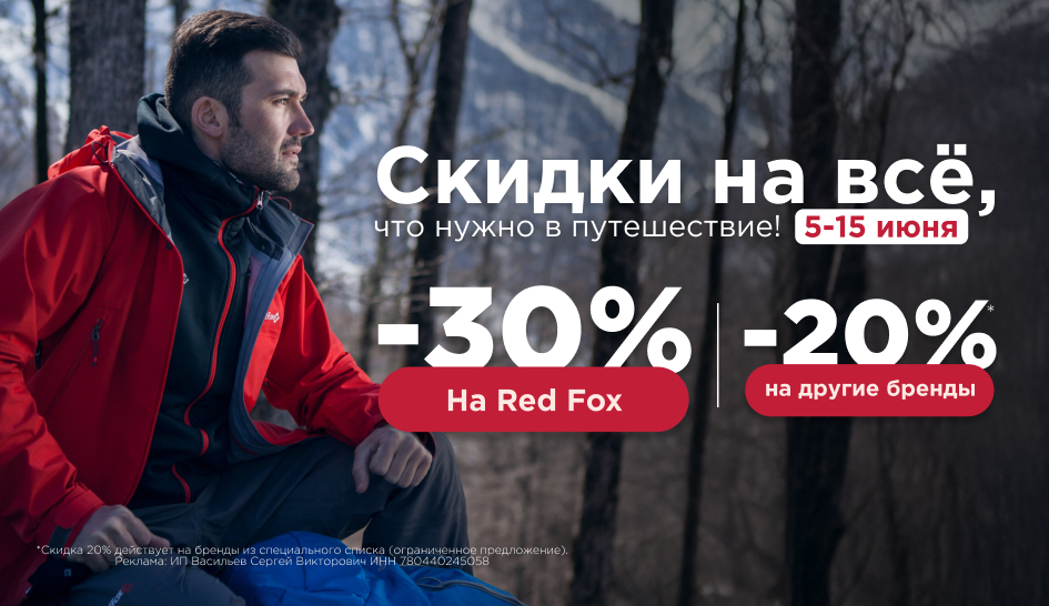 Скидка -30% на бренды: Red Fox, Atom, Anta, Elkland, 23&35, Rock Empire, Nature Hike, Роза Ветров.