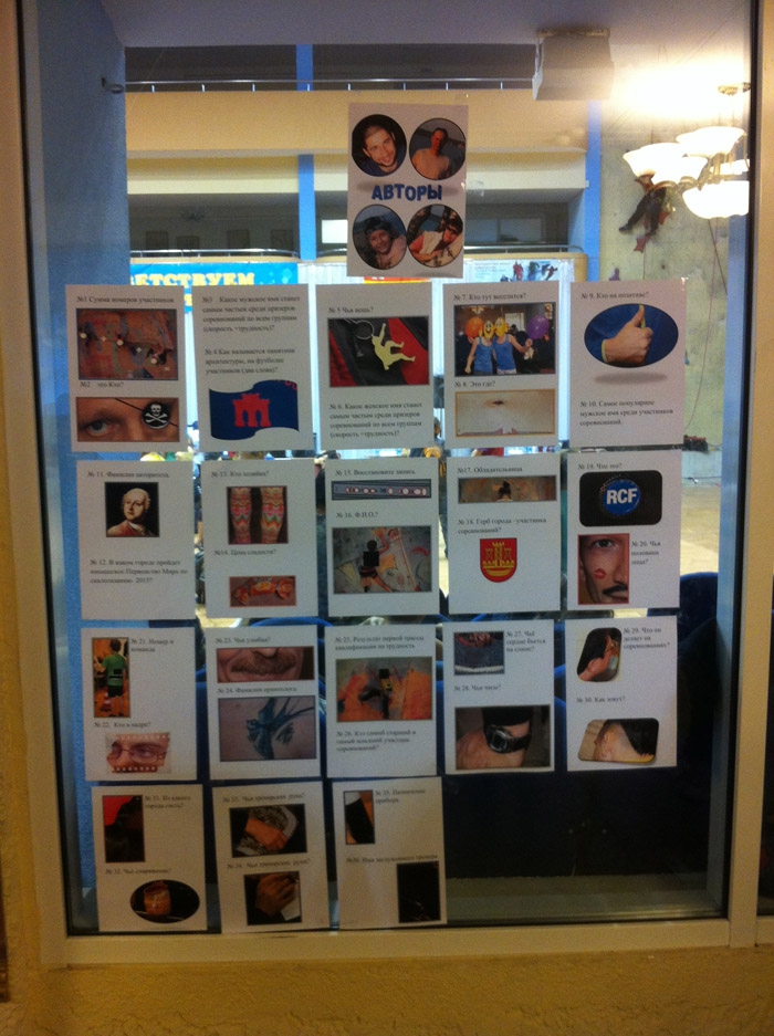 викторине 36 вопросов, тренер ходит по залу и раздает анкеты, в которые нужно